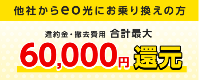乗り換え前の回線の工事費残債や、解約金などを最大60,000円までeo光が負担してくれます。