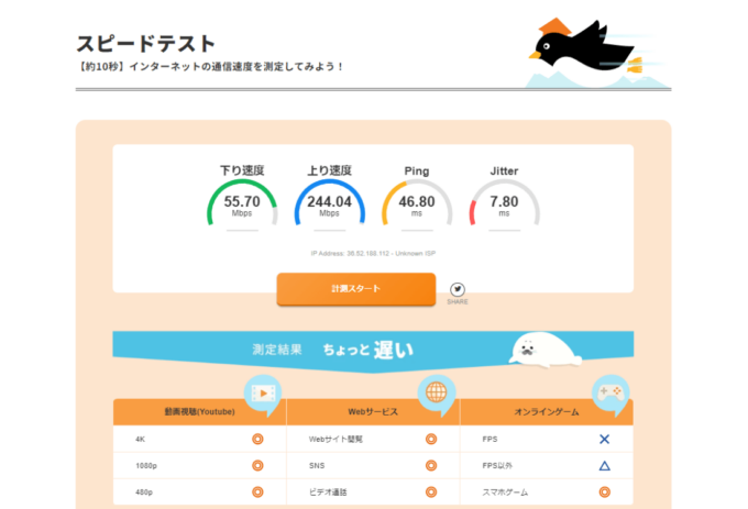 数秒~十数秒で、今使っているネット回線の速度が表示されます。