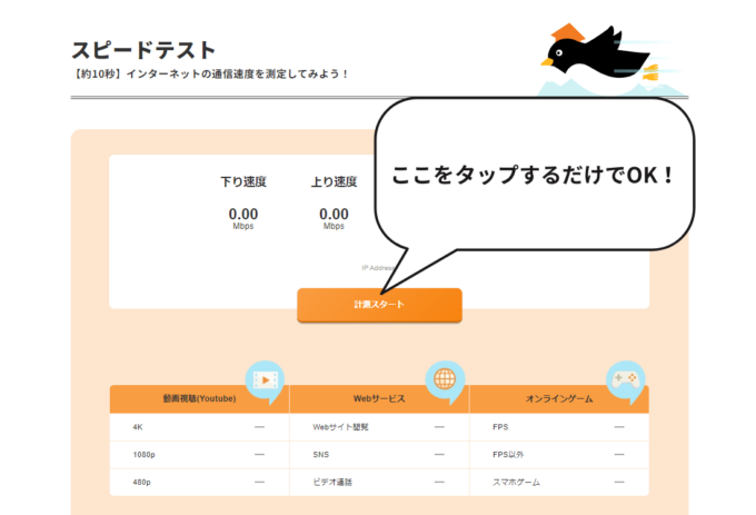 チェックするツールは、ネットのいろは「スピードテスト(通信速度測定)」でOKです。