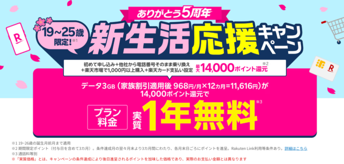 「19歳~25歳限定!新生活応援キャンぺーン」は、楽天ポイント最大14,000ptが還元されるキャンペーンです。