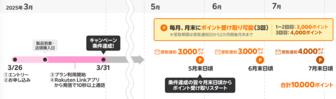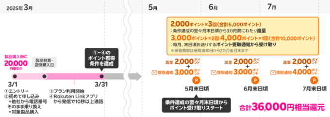 楽天モバイルのキャッシュバックポイントは、キャンペーンごとの条件を達成した翌々月の末頃に付与されます。