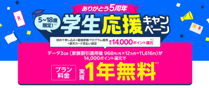 | 概要 | ①新規申し込み ②最強家族プログラム適用 ③楽天カードで支払い設定 上記①~③で14,000pt還元 |